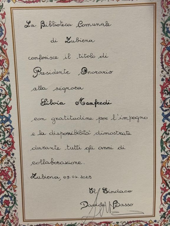 "La biblioteca comunale di Zubiena, conferisce il titolo di Presidente Onorario alla signora Silvia Manfredi, con gratitudine, per l'impegno e la disponibilità dimostrata durante tutti gli anni di collaborazione".