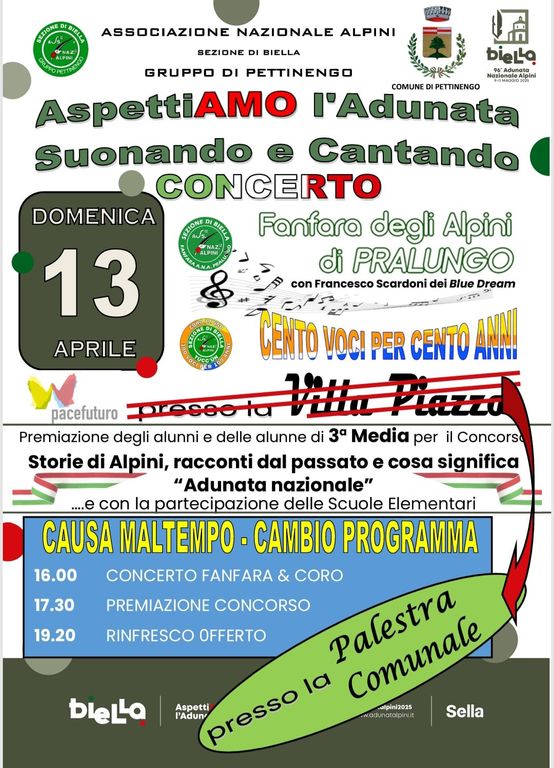 Invece di Villa Piazzo, l'evento si terrà nella palestra comunale del paese. L'iniziativa del gruppo Alpini di Pettinengo, in collaborazione con la Fanfara Alpini di Pralungo, vuole coinvolgere, oltre tutta la popolazione, anche le scuole del paese.
