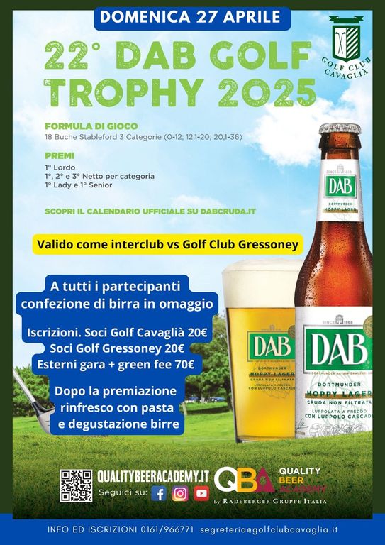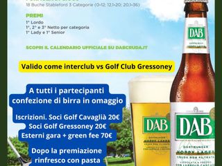 Domenica 27 c'è in programma il 22° Dab Golf Trophy (18 buche Stableford, 3 categorie - iscrizioni soci 20€, esterni 70€). Prevista confezione di birra in omaggio a tutti i partecipanti e a fine gara dopo la premiazione, degustazione di birre e rinfresco con pasta.