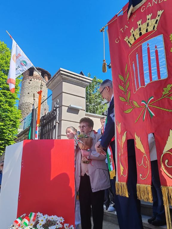 La Resistenza, prima che fatto politico, fu innanzitutto rivolta morale. La Resistenza è stata un vero moto nazionale un’esperienza collettiva condivisa in amplissimi settori della società, che ha visto uniti nella lotta, nel combattimento, ma anche in altre forme non armate la parte più viva e migliore del popolo italiano. Non ci sono negazionismi e revisionismi che reggano a questa verità storica. La ricerca storica – ha scritto in un messaggio il Presidente della Repubblica Sergio Mattarella – deve continuamente svilupparsi “ ma “senza pericolose equiparazioni “ tra i due campi in conflitto nella lotta di Liberazione nazionale dal nazifascismo “ In concomitanza del 80° anniversario della liberazione come avete notato ho scelto una postazione diversa, qui in piazza, per le orazioni ufficiali, perché proprio 80 anni fa su questa scalinata si celebrò un evento importante per tutta la comunità come ci porta un’articolo del biellese. il 21 ottobre 1945, nel cuore di Candelo, nella sua piazza, l’ANPI pose, dedicandola ai caduti per la libertà, una lapide con su scritti i nomi dei caduti sino allora conosciuti con il seguente motto: Onore a chi cadde in cammino ed esempio a chi resta a lottar “Per iniziativa dell'Anpi di Candelo, in unione col Fronte della Gioventù e con l’Unione Donne Italiane sono state tributate domenica 21 ottobre 1945 solenne onoranze ai 7 Caduti di Candelo per la libertà. Alle nove, nel vasto piazzale davanti il Municipio, era affluita una folla imponente di Candelesi e di rappresentanti di molti paesi.