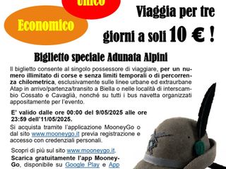 Novità anche sul fronte delle tariffe: utilizzare il bus nei 3 giorni dove non ci sarà distinzione tra corse extraurbane e urbane costerà 10 euro. Il biglietto consente al singolo possessore di viaggiare, per un numero illimitato di corse e senza limiti temporali o di percorrenza chilometrica, esclusivamente sulle linee urbane ed extraurbane Atap in arrivo/partenza/transito a Biella o nelle località di interscambio Cossato e Cavaglià, nonché su tutti i bus navetta organizzati appositamente per l’evento CLICCA QUI PER INFO Corse dunque illimitate per tutto il territorio a 10 euro. Corse illimitate, dunque, a un prezzo fisso per facilitare gli spostamenti sul territorio dalle ore 00:00 del 9/05/2025 alle ore 23:59 dell’11/05/2025.