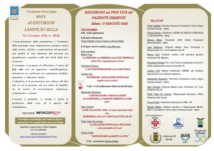 La Fondazione Cerino Zegna organizza il convegno “RIFLESSIONI sul FINE VITA del PAZIENTE DEMENTE” che affronta le tematiche dell’invecchiamento della popolazione con il conseguente aumento delle patologie neuro degenerative che pongono nuove sfide etiche, cliniche e organizzative nel garantire una qualità di vita dignitosa alle persone con decadimento cognitivo nelle fasi finali della loro esistenza.