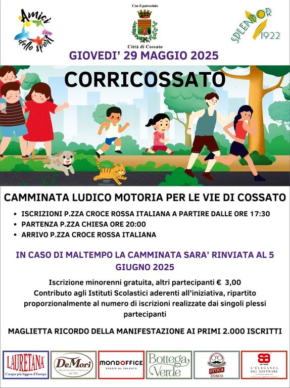 A Cossato giovedì 29 maggio è in calendario la 1^ Corricossato, km 6. E' una camminata ludico motoria. Le iscrizioni saranno in p.zza Croce Rossa Italiana a partire dalle ore 1 7:30, mentre la partenza p.zza chiesa ore 20:00. L'arrivo è p.zza Croce Rossa Italiana. In caso di maltempo la camminata sarà rinviata al 5 giugno 2025. Iscrizione minorenni gratuita, altri partecipanti € 3,00; contributo agli istituti scolastici aderenti all'iniziativa, ripartito proporzionalmente al numero di iscrizioni realizzate dai singoli plessi partecipanti. Sarà consegnata una maglietta ricordo della manifestazione ai primi 2.000 iscritti.