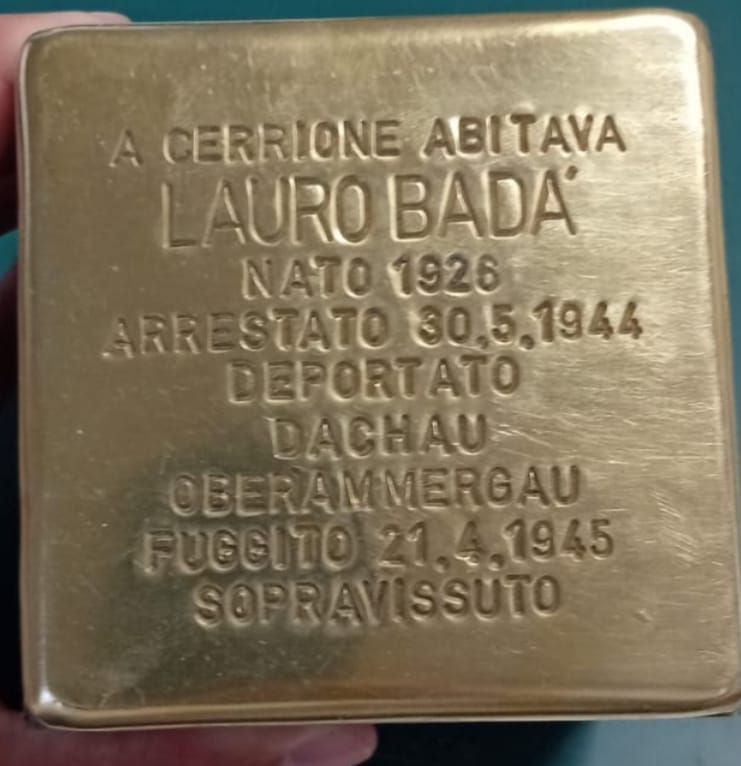 Per l'occasione, è stata posta la prima pietra d'inciampo, recante la scritta: “A Cerrione abitava Lauro Badà. Nato 1926, arrestato 30.05.1944, deportato Dachau. Fuggito 21.4.1945. Sopravvissuto”. Presenti anche i familiari del cittadino residente a Cerrione, oltre ad autorità civili e religiose, dirigenti, rappresentanti dell'ANPI ed insegnanti.