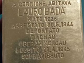 Per l'occasione, è stata posta la prima pietra d'inciampo, recante la scritta: “A Cerrione abitava Lauro Badà. Nato 1926, arrestato 30.05.1944, deportato Dachau. Fuggito 21.4.1945. Sopravvissuto”. Presenti anche i familiari del cittadino residente a Cerrione, oltre ad autorità civili e religiose, dirigenti, rappresentanti dell'ANPI ed insegnanti.