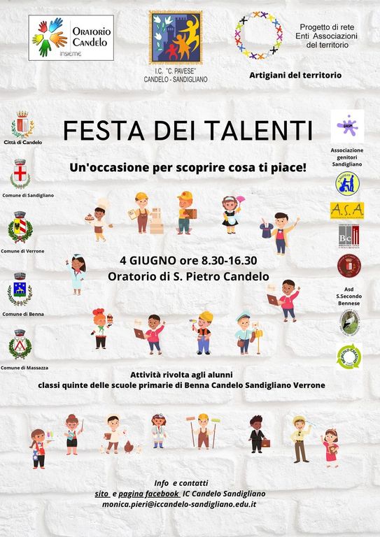 Torna la Festa dei Talenti rivolta agli alunni delle classi quinte della scuola primaria e classi prime della scuola secondaria dell'Istituto Comprensivo Cesare Pavese Candelo Sandigliano. L'appuntamento è il 4 giugno, dalle 8.30 alle 16, 30, presso l’Oratorio di Candelo San Pietro, in via San Francesco.