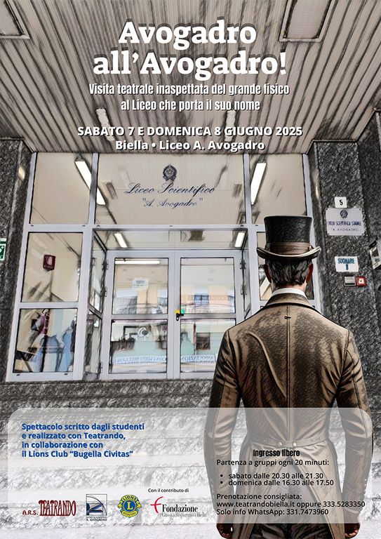 Lo spettacolo è il momento conclusivo del progetto “Amedeo Avogadro – Conoscere il passato per vivere le sfide del futuro” che, promosso dal Lions Club “Bugella Civitas” in collaborazione con il Liceo Scientifico “A. Avogadro” di Biella e con il sostegno della Fondazione Crb, ha già coinvolto gli studenti in altre iniziative (dalle conferenze ai concerti), sempre ispirate allo studioso, che aveva origini biellesi ed è sepolto a Quaregna nella tomba di famiglia. “Avogadro all’Avogadro!”, come indica il sottotitolo “Visita teatrale inaspettata del grande fisico al Liceo che porta il suo nome”, si svolgerà nella sede del Liceo “Avogadro” di Biella, sabato 7 e domenica 8 giugno.