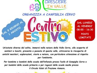 L'associazione APS Crescere in Valle organizza anche per quest'anno il centro estivo che si terrà dal 9 giugno al 1° agosto per i bambini della scuola primaria e delle scuole medie presso il Circolo Valet di Campiglia, e per tutto il mese di luglio presso i locali dell' asilo per i bambini della scuola dell' infanzia.
