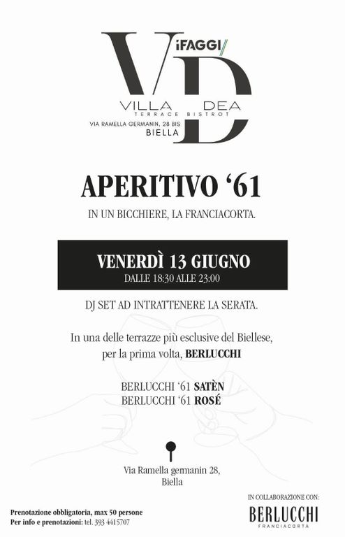 Venerdì 13 giugno, dalle 18.30 alle 23, è in programma l'Aperitivo ’61 – Opening Night nella splendida cornice di Villa Dea Terrace Bistrot, a Biella, una terrazza total white dove il tramonto e il profumo dell’estate faranno da sfondo a una serata esclusiva tra tapas d’autore, atmosfera raffinata e le bollicine eleganti di Berlucchi Franciacorta.