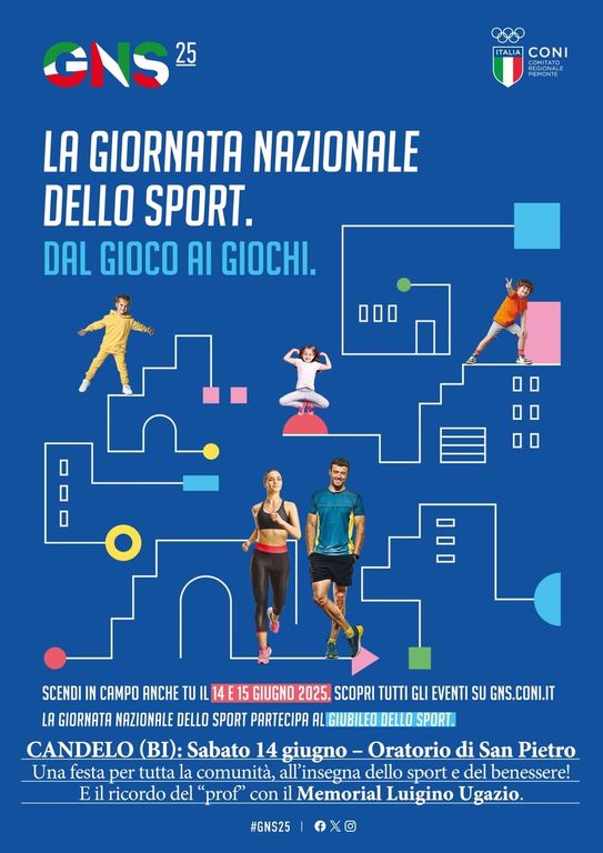 Il CONI, Comitato Regionale Piemonte - Delegazione di Biella, con il patrocinio della Città di Candelo, è lieto di invitare tutta la cittadinanza alla Giornata Nazionale dello Sport, che si terrà sabato 14 giugno 2025 presso l’Oratorio di San Pietro.