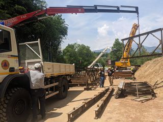 Il ponte provvisorio, tipologia modulare di origine militare, è stato installato in un solo fine settimana, tra sabato e domenica, restituendo la viabilità lungo la SP502 tra Biella e Pollone. Un’opera realizzata con velocità ed efficienza per far fronte all’interruzione causata dal crollo del ponte originario, un doppio ponte della Strada Provinciale a scavalco delle gole del Fiume Oremo, danneggiato dalle piogge torrenziali di aprile. Vengono chiamati a una prima valutazione i Genieri Volontari del Varesotto e del distaccamento dell’Alessadrino, ai quali si affiancano i neonati Genieri Insubri del VCO; il Nucleo RicoPreCon di Samarate trova la soluzione.