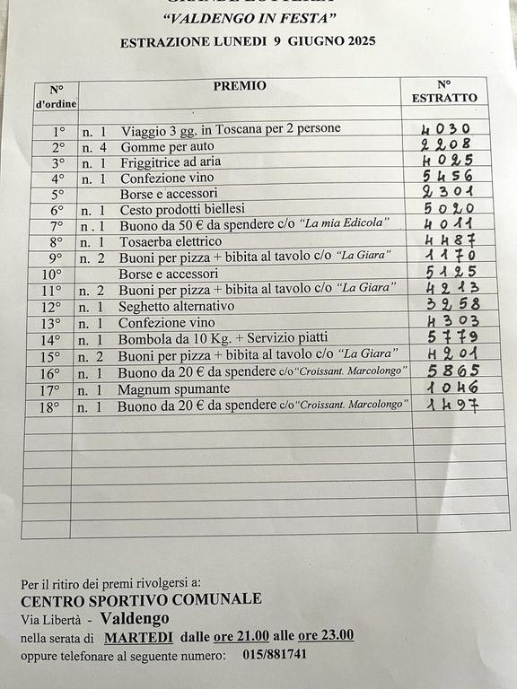 Valdengo in Festa ha dato l'occasione a tanti di prendere parte anche alla lotteria benefica. L'estrazione è avvenuta il 9 giugno scorso. Per il ritiro dei premi si può chiamare il numero: 015.881741.
