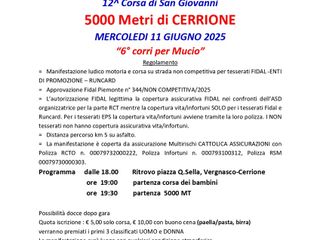 Il primo appuntamento è questa sera mercoledì 11 giugno a Cerrione. La Pro Loco Cerrione A.P.S. con la collaborazione tecnica AS Gaglianico 1974 Organizzano la MANIFESTAZIONE PROMOZIONALE/LUDICO MOTORI 12^ Corsa di San Giovanni 5000 Metri “6° corri per Mucio”. Si tratta di una manifestazione ludico motoria e corsa su strada non competitiva per tesserati FIDAL -ENTI DI PROMOZIONE – RUNCARD = Approvazione Fidal Piemonte n° 344/NON COMPETITIVA/2025. Questo il programma: dalle 18.00 Ritrovo piazza Q.Sella, Vergnasco-Cerrione ore 19:00 partenza corsa dei bambini ore 19:30 partenza 5000 MT. La manifestazione avrà luogo con qualsiasi condizione atmosferica Info: Luca 327 3699109 / Claudio 348 7031033 / Resp. Org. Cappio Alberto 339 7123903.