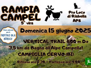Domenica 15 giugno 2025 torna l'atteso appuntamento con la Rampia Campel, vertical trail non competitivo organizzato dalla Pro Loco di Riabella, già promotrice del mini trail #distacalacrava RUN. L’evento si svolgerà a Campiglia Cervo, con partenza dalla località Naiasco, poco oltre il pittoresco ponte in pietra di frazione Bogna, lungo la Strada Provinciale 100. Il tracciato, interamente in salita, si sviluppa per 3,5 km con 800 metri di dislivello positivo, snodandosi lungo la storica mulattiera del “Crest” (sentiero E12), attraversando il borgo di Riabella e proseguendo sul sentiero E10 fino all’Alpe Campello, non lontano dalla suggestiva Galleria Rosazza. Il percorso, contraddistinto da una segnaletica con il logo di una capretta nera, è tecnico e sterrato: è richiesto abbigliamento da montagna e scarpe da trail. Il tempo massimo previsto è di tre ore e sarà attivo un servizio “scopa” per garantire la sicurezza degli ultimi concorrenti. La partenza è fissata per le ore 9.00, mentre le iscrizioni saranno possibili in loco a partire dalle 7.30, oppure in preiscrizione entro giovedì 12 giugno. La Rampia Campel rientra nel circuito Trittico dla Bürsch, assieme al mini trail #distacalacrava RUN (svoltosi il 18 maggio) e alla Corsa in Montagna del Gruppo Alpini Valle del Cervo (in programma il 2 agosto). Il punteggio si accumula in base al piazzamento e dà diritto a premi finali solo per chi partecipa a tutte le tre gare. È previsto anche un riconoscimento di partecipazione per chi completerà l'intero trittico. L’iniziativa, patrocinata dal Comune di Campiglia Cervo, valorizza il territorio e promuove uno stile di vita attivo in un ambiente naturale straordinario. Per ulteriori informazioni: Enrico 333.710.804.