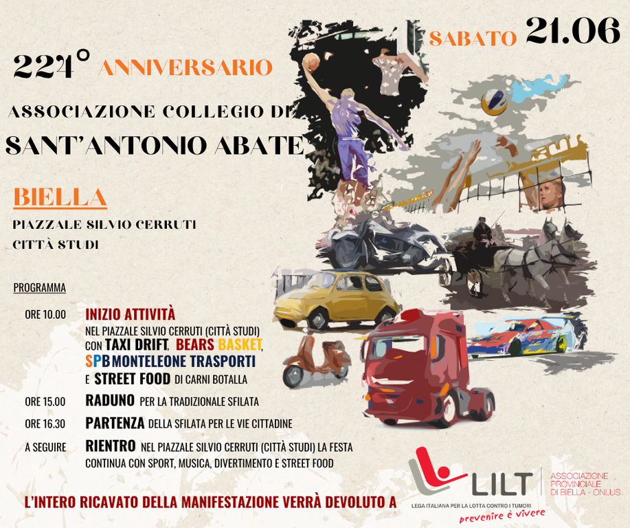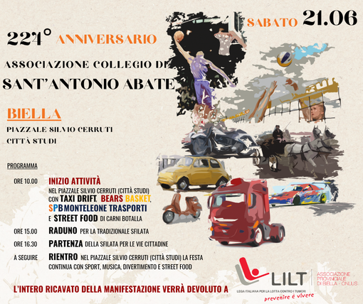Biella, sabato 21 giugno, a Città Studi, nel Piazzale Silvio Cerruti. Torna anche quest'anno la tanto attesa Festa dei Carrettieri per il 224° anniversario dell'Associazione Collegio di Sant'Antonio Abate di Biella. La manifestazione promette di essere un evento imperdibile, anche grazie alla collaborazione delle diverse aziende e realtà del territorio biellese.