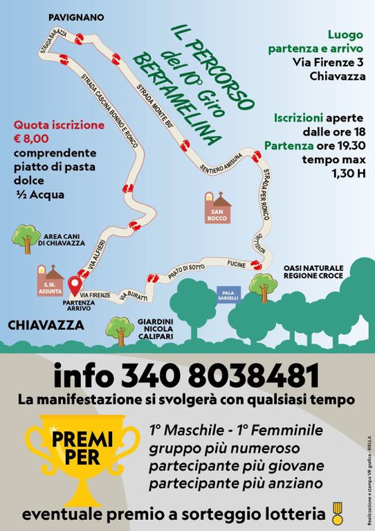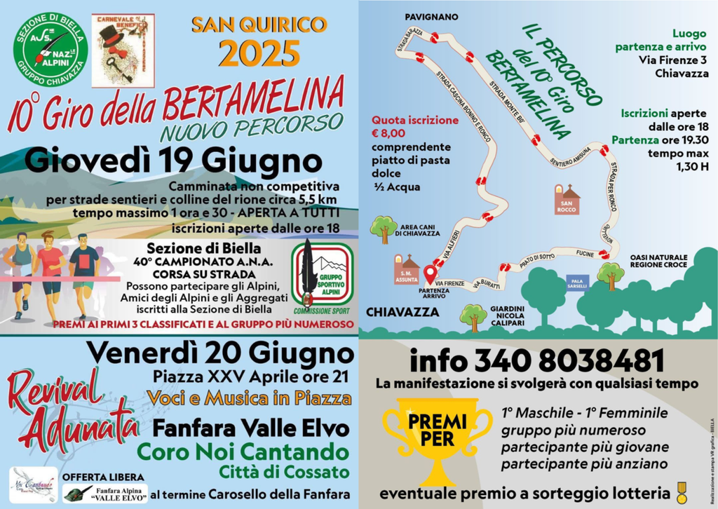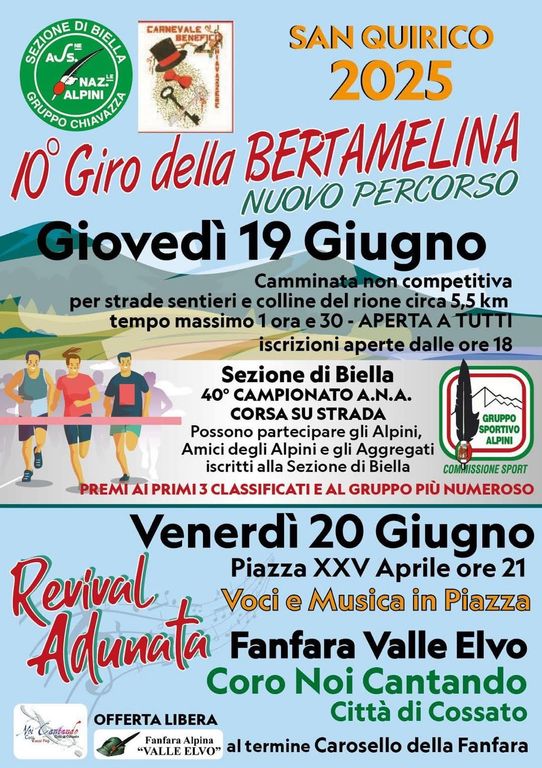 La prima gara della settimana sarà giovedì 19 a Biella Chiavazza, dove è in calendario il Giro della Bertamelina alle 10° edizione, camminata non competitiva lunga 5,5 km per strade e sentieri del rione. L'evento è 40° campionato ANA Biella. Luogo di arrivo e partenza via Firenze 3, davanti al teatro. Le iscrizioni si aprono dalle 18, la partenza è alle 19,30, con quota di iscrizione 8 euro. Si parte da via Firenze, si prosegue verso via Buratti, Prato di Sotto, Fucine, Novellino, strada per Ronco, sentiero Amisuna, strada Monte Bo, strada Barazza, strada Cascina Bonino e Ronco e via Alfieri.
