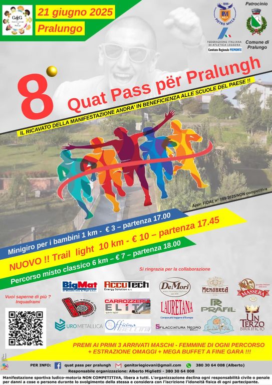 Questa settimana si corre a Pralungo la 8^ Quat Pass per Pralungh sabato 21. Tre i percorsi proposti, un Minigiro per bambini, Distanza: 1 km. Quota di partecipazione: € 3 Partenza: ore 17:00 Ritrovo: Polivalente di Pralungo. Distanza: 10 km, Quota di partecipazione: € 10; Partenza: ore 17:45; Ritrovo: Polivalente di Pralungo; Distanza: 6 km, Quota di partecipazione: € 7, Partenza: ore 18:00, Ritrovo: Polivalente di Pralungo. Partecipare alla Quat Pass për Pralungh significa condividere una giornata di sport e allegria, ma anche contribuire a un obiettivo importante. L’intero ricavato dell’evento sarà devoluto in beneficenza alle scuole del paese, sostenendo progetti educativi, attività didattiche e iniziative a favore degli studenti di Pralungo.