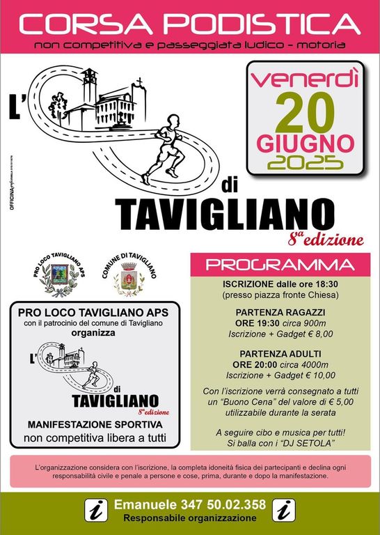 Venerdì 20 giugno a Tavigliano si corre l’8 di Tavigliano, Corsa podistica e passeggiata ludico-motoria non competitiva aperta a tutti organizzata dalla Pro Loco di Tavigliano. Due i percorsi proposti: percorso per i bambini - 900 m circa e percorso adulti - 4000 m circa. Partenza ragazzi 19,30, partenza adulti alle 20 di fronte alla chiesa.