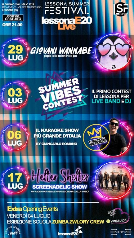 Lessona E20 Live propone invece 4 spettacoli: il primo si terrà il 29 luglio ed è perfetto per gli amanti dei Pinguini Tattici Nucleari: è intitolato Giovani Wannabe ed è un tributo alla famosa band. Il 3 luglio potrete partecipare al Summer vibes contest: il primo contest di Lessona per live band e dj. Vi piace il karaoke? Perfetto, allora non potete perdervi l’evento del 6 luglio! Giancarlo Romano presenterà il karaoke show più grande d’Italia. Infine, il 17 luglio gli Helter Shelter terranno un screenadelic show e vi faranno viaggiare nella storia del cinema e della musica.