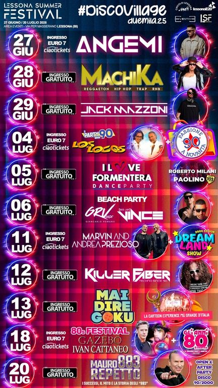 Ecco il programma per quanto riguarda #DiscoVillage: il 27 giugno si esibirà Angemi, il 28 sarà il turno di Machika, adatto a chi ama il reggeton, l’hip hop, la trap e l’RnB. L’ingresso è gratuito. Il 29 giugno siamo pronti a scatenarci con Jack Mazzoni e l’ingresso è nuovamente gratuito. Il 4 di luglio, invece, i protagonisti saranno Los Locos con la loro musica anni Novanta. Il 5 luglio, con ingresso gratuito, si potrà partecipare al dj set di I love Formentera, con la partecipazione di Roberto Milani e di Paolino di Radio 105: imperdibile! Il 6 luglio il testimone passa a GRVoice (Giancarlo Romano) e al dj Vince. Anche quel giorno l’ingresso sarà gratuito.