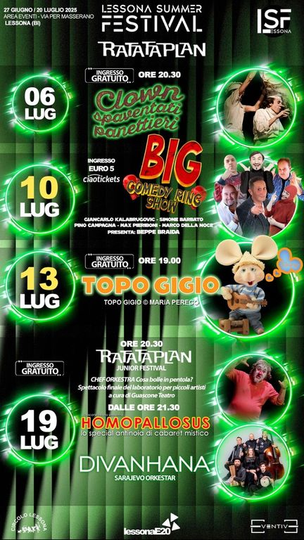 Il Ratataplan ha infine in programma diversi appuntamenti: Il 6 luglio, alle 20.30, avrà luogo lo show dei Clown spaventati panettieri e l’ingresso sarà gratuito. Il 10 di luglio ci sarà lo spettacolo “Big comedy ring show”. Molto atteso è Topo Gigio, il quale si esibirà alle 19 del 13 luglio. L’ingresso è gratuito. Il 19 luglio, infine, alle 20 sarà possibile assistere al Ratataplan Junior Festival. Dalle 21 si terrà lo spettacolo Homopallosus, perfetto per combattere la noia! Anche l’orchestra di Sarajevo Divanhana si esibirà lo stesso giorno. L’ingresso è gratuito per tutti gli eventi di quel giorno