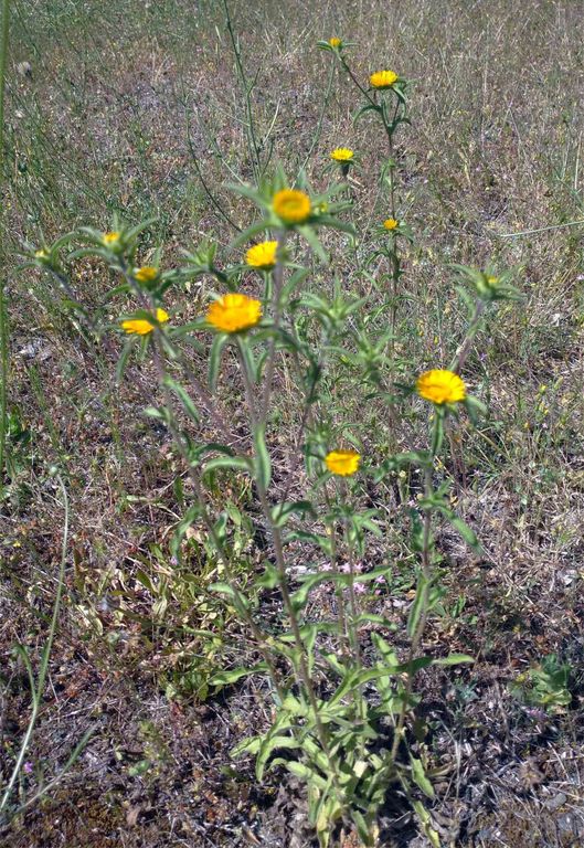 Nome italiano: Asterisco spinoso - Nome sardo: Sproni de oru, bulciadinu - Nome spagnolo: Castañuela o Patagallo. Può essere chiamata anche Pincho amarillo, Pincho cuco o Árnica falsa. Pianta annua o biennale a distribuzione eurimediterranea, è presente in tutte le regioni d’Italia, ad eccezione della Valle d’Aosta e del Trentino-Alto Adige. Il nome specifico fa riferimento alla presenza di spine sui capolini dopo la fioritura. In ambito tradizionale, veniva utilizzata per l’abbruciatura delle setole del maiale, motivo per cui è nota anche con il nome sardo bulciadinu.