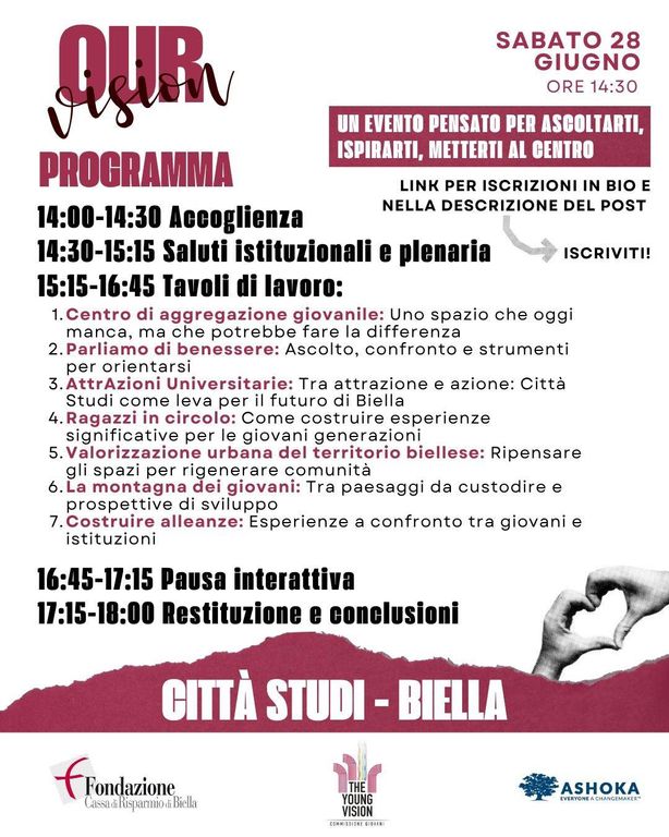 Si svolgerà sabato 28 giugno dalle ore 14.30 alle 18.00, a Città Studi l’evento “Our Vision” promosso dalla Commissione Giovani della Fondazione Cassa di Risparmio di Biella con il supporto della Fondazione e Ashoka Italia. L’iniziativa è inserita nel primo “Festival dei Giovani” realizzato in collaborazione con varie associazioni ed enti del territorio nell’ambito di “Biella estate” e ha come obiettivo quello di presentare la Commissione Giovani come motore di cambiamento per le giovani generazioni; celebrare il protagonismo giovanile a Biella, riconoscendo e valorizzando le iniziative e i progetti che i giovani stanno già portando avanti; ispirare all’essere changemaker (protagonisti del cambiamento), stimolando i partecipanti a pensare in modo innovativo e ad assumersi la responsabilità di generare un cambiamento positivo nel proprio territorio; favorire lo scambio di idee e progetti tra giovani e organizzazioni della società civile, creando opportunità di collaborazione e crescita reciproca; iniziare un percorso di creazione di una rete tra giovani, istituzioni, associazioni, organizzazioni.