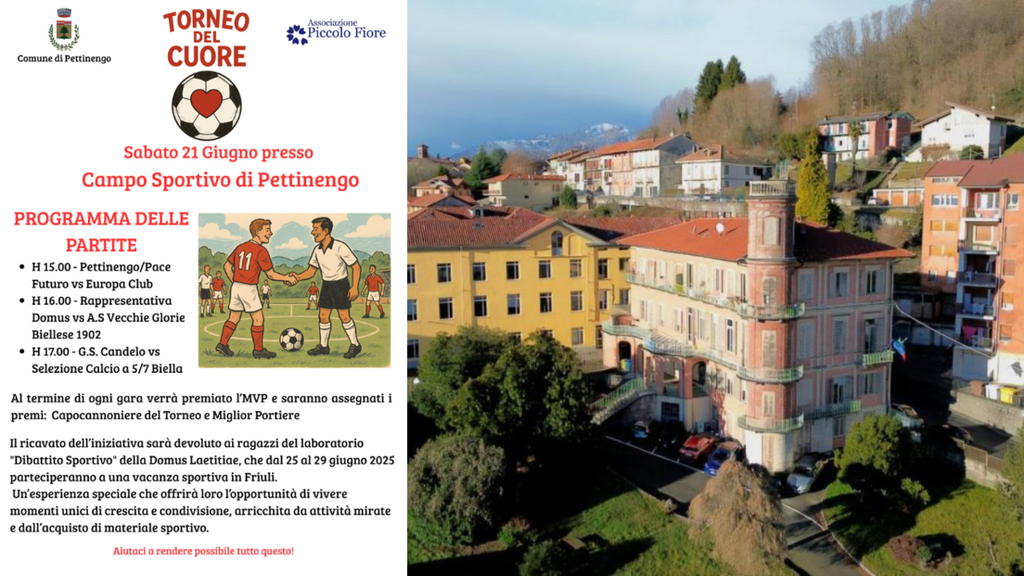 Il Comune di Pettinengo, in collaborazione con le realtà associative del territorio, è lieto di annunciare il “Torneo del Cuore”, manifestazione sportiva a scopo benefico che si terrà sabato 21 giugno, presso il Campo Sportivo comunale.
