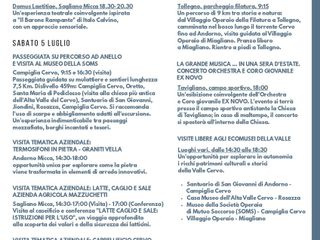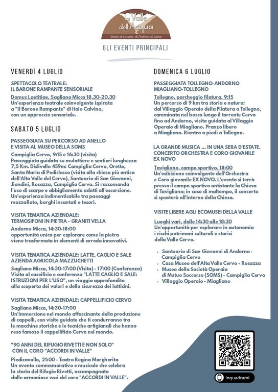 A fare da collante eventi culturali e musicali serali con il Barone Rampante Sensoriale presso la Domus Laetitiae, a cura dell’Associazione Storie di Piazza (venerdì 4 luglio); si prosegue con una serata a Piedicavallo dedicata alla storia del Rifugio Rivetti accompagnata dal Coro Accordi in Valle, il coro della Valle del Cervo (sabato 5 luglio). Si concluderà il tutto a Tavigliano (domenica 6 luglio) con il concerto dell’orchestra Ex Novo.