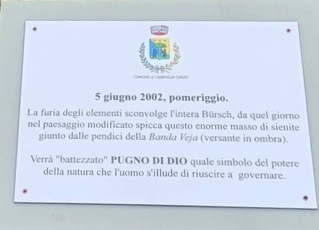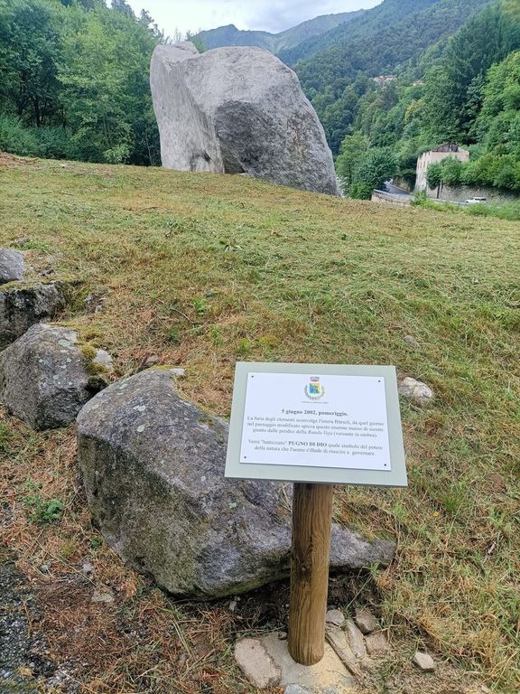 L'opera in sienite è stata donata dalla ditta Vella Graniti di Andorno Micca, presente con i suoi titolari assieme all'amministrazione comunale. Inoltre, è stato presentato il restauro della pietra denominata “Pugno di Dio”, portata a valle dalla grande piena del 5 giugno 2002. Simbolo vivente del potere della natura che l'uomo si illude di riuscire a governare.