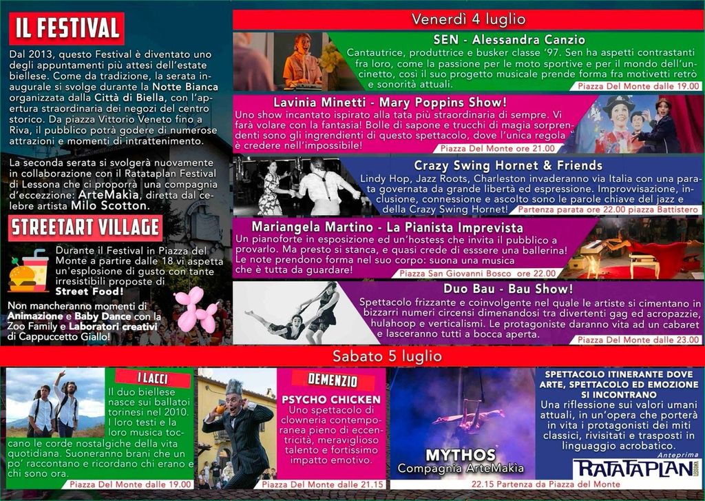 Il festival, organizzato dall’Ente Manifestazioni Biella Riva con il contributo del Circolo Lessona e in collaborazione con il Ratataplan Festival di Lessona, propone quest’anno un cartellone ricco di sorprese. In scena si alterneranno 20 artisti tra circensi, musicisti, danzatori e animatori, con una particolare attenzione alla dimensione familiare e inclusiva dell’evento.