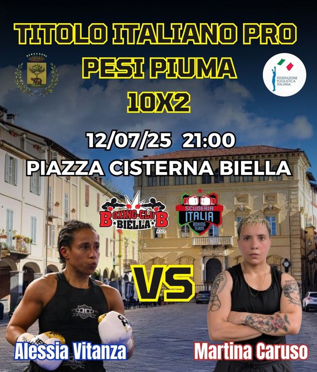 Sabato 12 luglio 2025, Piazza Cisterna sarà teatro di un evento sportivo di grande rilievo: la XX edizione della manifestazione “Boxe Sotto Le Stelle”. L’appuntamento clou della serata sarà il match valido per il Titolo Italiano Pro Pesi Piuma (10x2), che vedrà opposte Alessia Vitanza (Boxing Club Biella) e Martina Caruso (Scuderia Italia Boxing Team).