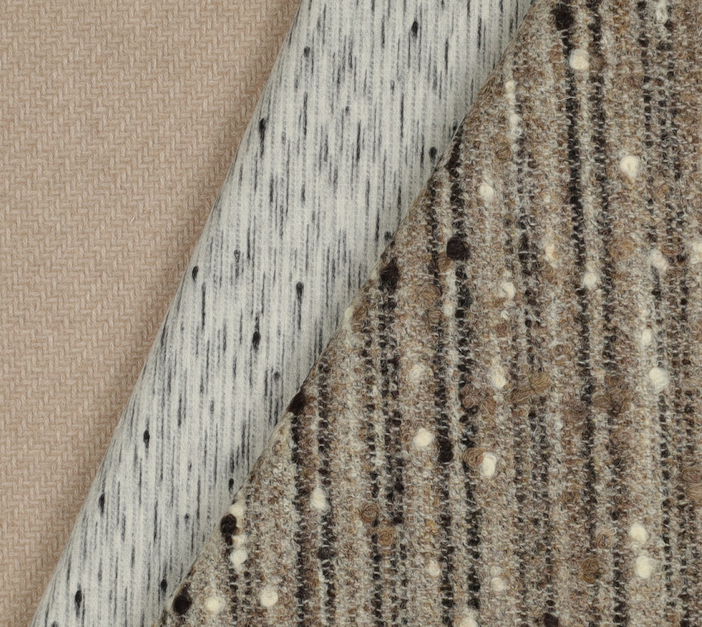 La varietà di finissaggi, le strutture tridimensionali e le nuove combinazioni cromatiche danno vita a tessuti dal carattere distintivo, morbidi e performanti. Ampia è la selezione di jacquard d’avanguardia, in cui fondi innovativi creano pattern nascosti, effetti visivi e tattili inediti, per tessuti fortemente identitari. I nuovi cashmere elasticizzati introducono un’idea di comfort dinamico, ideale per capi che uniscono morbidezza e funzionalità. Una rivoluzione discreta che apre nuove possibilità di utilizzo per questa fibra nobile. La palette colori spazia tra grigi minerali, nuance boschive, tabacco, ruggine, blu, con accenti di ocra e rame: toni caldi e strutturati che si fondono con superfici melangiate e pattern discreti ma riconoscibili.
