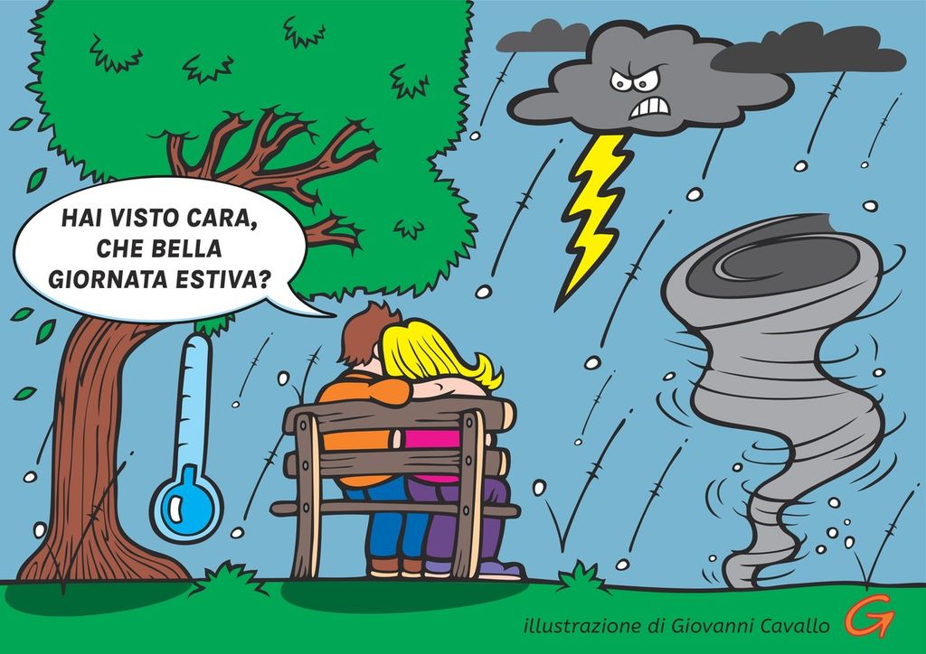 L’illustrazione di Giovanni Cavallo – con due innamorati che si godono una “bella giornata estiva” sotto una tempesta apocalittica – riassume perfettamente la situazione. Ironica? Sì. Ma neanche troppo lontana dalla realtà. Ormai ci siamo abituati: si parte con con il cielo blu e il canto delle cicale, si finisce con i sottopassi allagati e le foglie spazzate via come coriandoli a Carnevale.