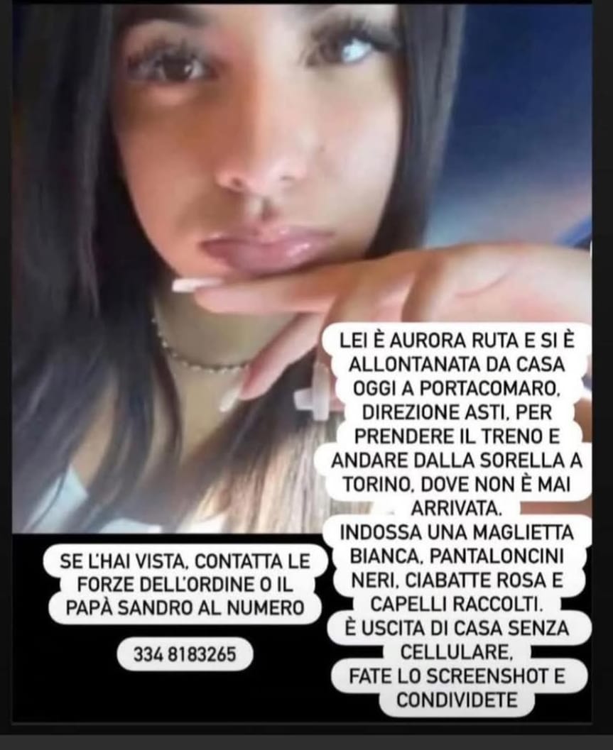 Si moltiplicano in queste ore gli appelli sui social per ritrovare Aurora Ruta, 17 anni, scomparsa oggi. La giovane, residente a Portacomaro, sarebbe dovuta rientrare a casa intorno alle 13, ma non è mai arrivata a destinazione e non ha più dato notizie di sé.