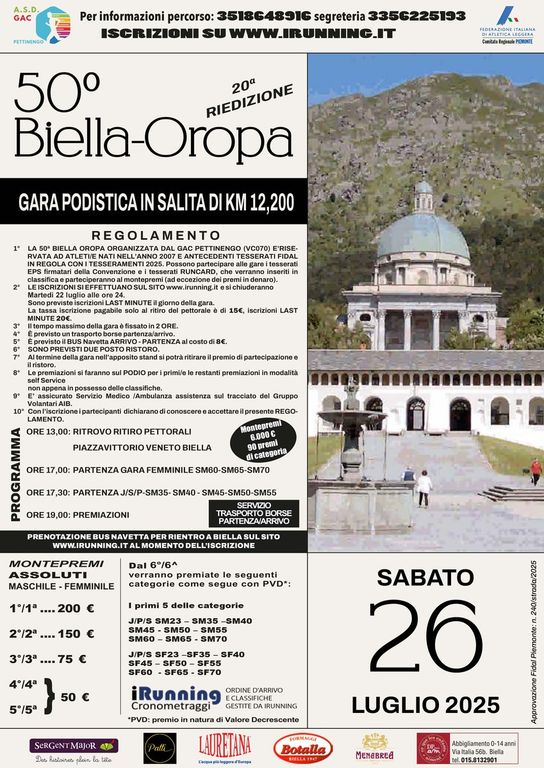 Sabato 26 luglio, si svolgerà una gara podistica in salita di 12 chilometri, ossia la 50° Biella-Oropa. L’evento è stato organizzato dal GAC Pettinengo ed è riservato ad atleti o atlete nati nel 2007 o negli anni precedenti.