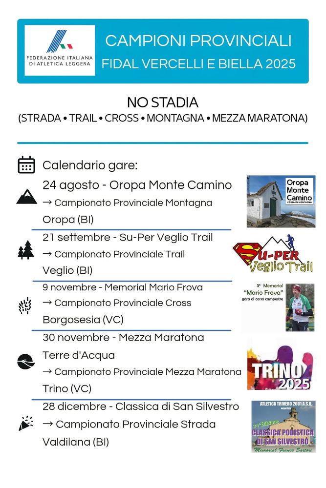 Il primo appuntamento è il 24 agosto con la Oropa-Monte Camino, seguirà il 21 settembre Su Per Veglio Trail, poi sarà la volta il 9 novembre del Memorial Mario Frova e il 30 novembre Mezza Maratone Terre d'Acque e il 28 dicembre la Classica di San Silvestro.