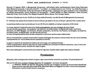 Questa sera giovedì 14 agosto a Mongrando Curanuova, nell'ambito delle manifestazioni della Festa Patronale della Madonna Assunta si corre per il Trofeo ANSPI LA VETTA intitolato a Luigi (Gino) Accotto, Gabriele Crida, Piero Cullaz, Pier Beppe Guabello, Mario Sasso, Pier Giorgio Sasso. Si tratta di una corsa non competitiva aperta a tutti.