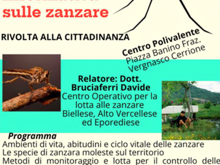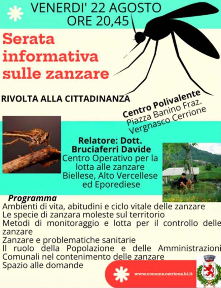 Venerdì 22 agosto alle ore 20.45 si terrà presso il Centro Polivalente di Piazza Banino, frazione Vergnasco di Cerrione, una serata informativa sulle zanzare, rivolta a tutta la cittadinanza.