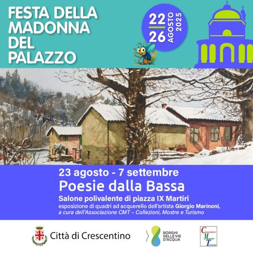 Giorgio Marinoni, pittore biellese di Pollone dopo aver il Terzo Premio all' International Watercolor Academy Award,il massimo riconoscimento nel panorama mondiale dell’acquarello, espone a Crescentino, in occasione della Festa della Madonna del Palazzo presso il Polivalente di Piazza IX Martiri.
