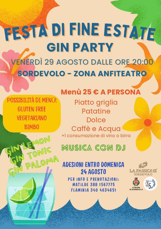 Il comune, la Pro Loco e La Passione di Sordevolo, come tutti gli anni, hanno organizzato la Festa di fine estate “Gin Party”, che si terrà venerdì 29 agosto, a partire dalle 20:00.