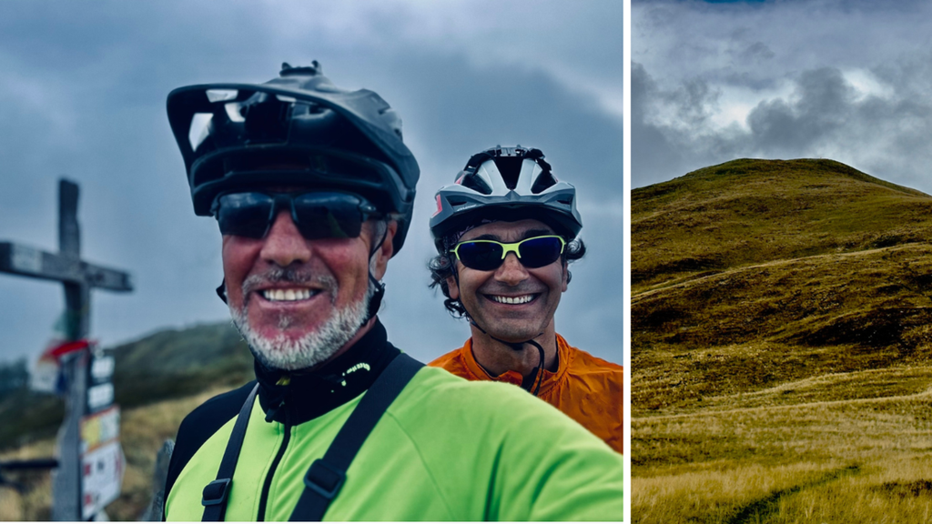 Da lì è nata un’idea ancora più ambiziosa: tentare la salita verso il Monticchio, con lo sguardo rivolto anche alla “Pera Forà”. Senza troppe esitazioni, i ciclisti hanno affrontato i pendii erbosi, che ben presto si sono trasformati in un tratto ripido (oltre il 25% di pendenza) e sassoso. Una sezione di circa 150 metri di dislivello positivo da percorrere spingendo la bici, fino a conquistare la cresta. Le nuvole minacciose in direzione Pera Forà e Bonom hanno fatto optare per la cima del Monticchio, raggiunta a quota 1.700 metri, alternando tratti in sella e tratti a piedi.
