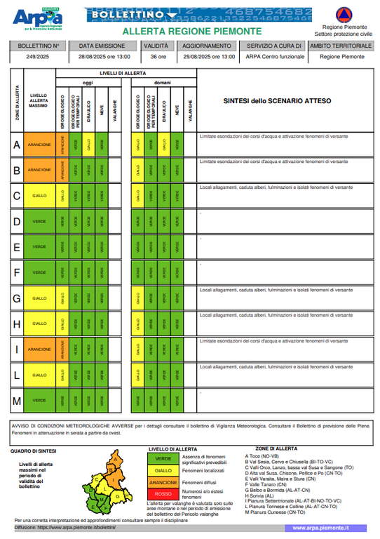 Confermata per oggi ALLERTA ARANCIONE per rischio idrogeologico su Piemonte settentrionale e gialla su Torinese e zone meridionali con innalzamento dei livelli del reticolo secondario, locali esondazioni e allagamenti, fenomeni di versante e cadute alberi.