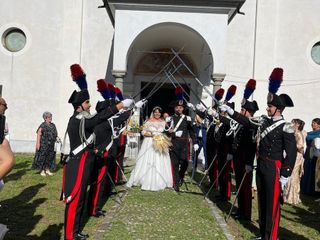 Amici e parenti hanno festeggiato gli sposi al termine della cerimonia, insieme all'immancabile picchetto d'onore in alta uniforme nel sagrato della chiesa di Santa Maria, a Candelo.
