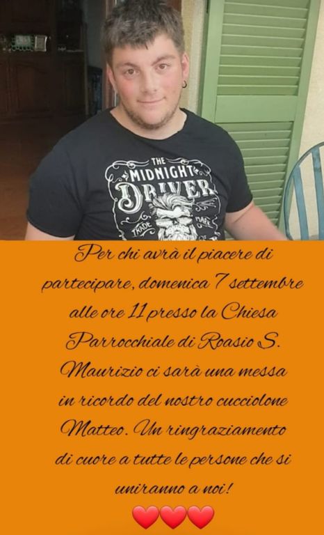 Domenica 7 settembre saranno due anni da quel tragico giorno in cui Matteo Senfet, appena 17 enne, ha perso la vita in un tragico incidente all’incrocio delle “quattro strade” a Roasio, dove abitava con la sua famiglia. E proprio per ricordarlo, la mamma e il papà e i fratelli, invitano chi avrà piacere a partecipare alle 11 nella chiesa parrocchiale di Roasio di San Maurizio, a una messa in ricordo di Matteo.