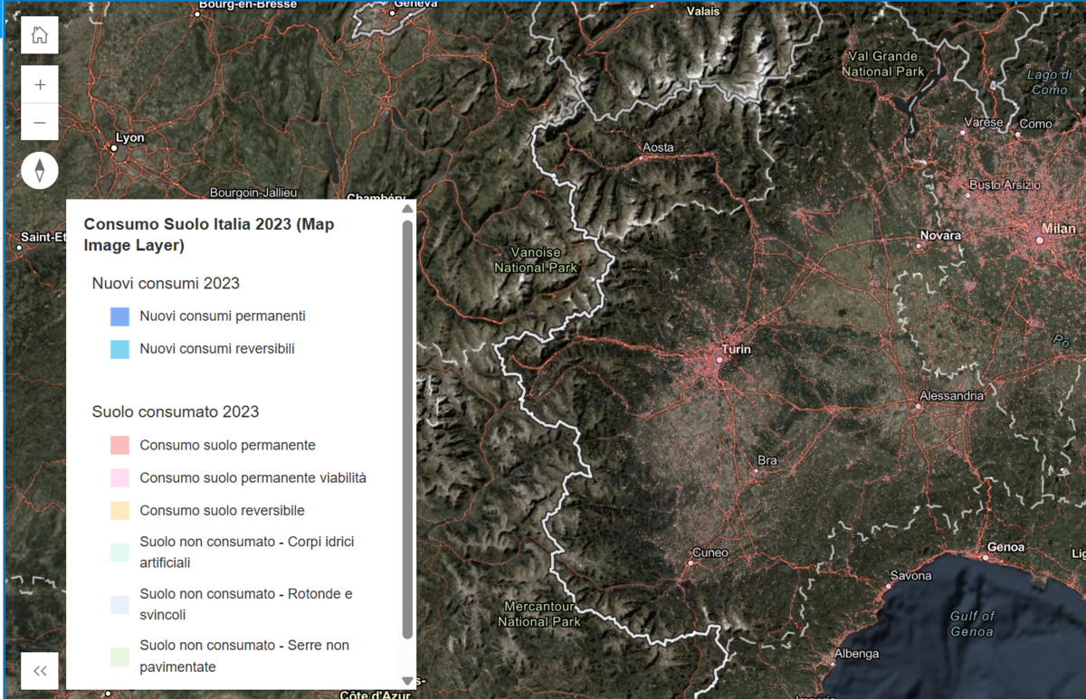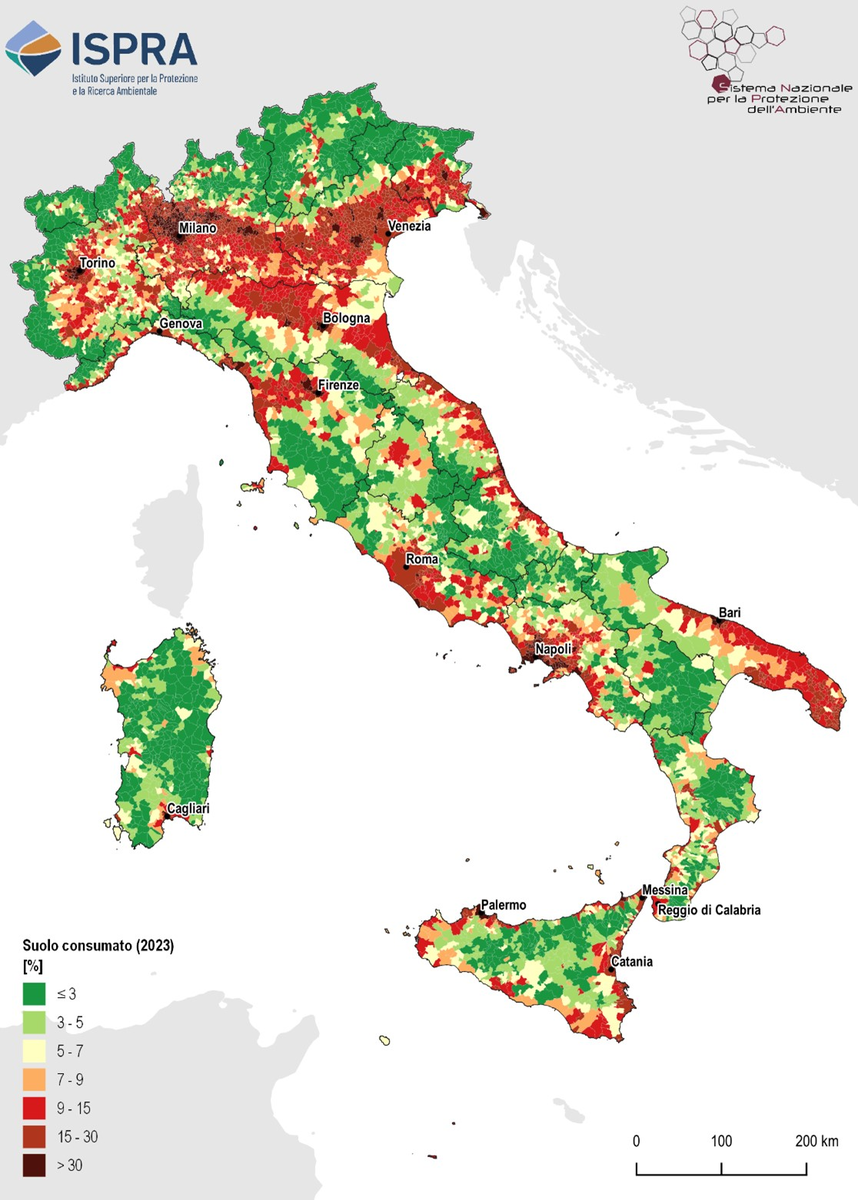 Guardando al Piemonte, si tratta della quarta Regione in assoluto per superficie di suolo consumato (dati fino al 2023), con 170 mila ettari, pari al 6,72% del totale, poco sotto la media italiana del 7,16%. Rapportato alla popolazione, ogni piemontese "consuma" 402 metri quadri. Nel biennio 2022-2023, l'aumento è stato di 1,30 metri quadri per abitante l'anno. I nuovi ettari consumati sono stati 553, pari allo 0,33% del totale della superficie della Regione. Paragonando il Piemonte alla Lombardia, quest'ultima negli stessi anni ha consumato 728 ettari di suolo, equivalente allo 0,25% della superficie regionale.