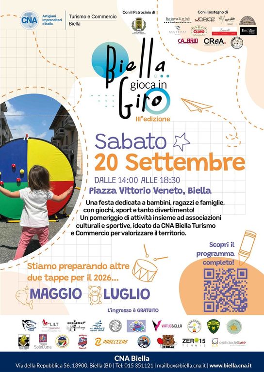 «Il nostro Gruppo – spiega Claudia Papero, Presidente di CNA Commercio e Turismo Biella – ha il piacere di presentare la terza edizione di Biella Gioca in Giro, che quest’anno proporrà ben tre date, ognuna delle quali coinvolgerà una diversa zona della città, divisa in nord, centro e sud. La prima data in calendario, quella di sabato 20 settembre, nel cuore di Biella, avrà come palcoscenico Piazza Vittorio Veneto e i Giardini Zumaglini. L’evento vedrà coinvolte numerose associazioni sportive e culturali che intratterranno adulti, bambini e ragazzi con esibizioni dei loro atleti e tesserati, e daranno la possibilità di sperimentare le varie attività. Questo primo pomeriggio di sport, gioco e divertimento sarà il trampolino di lancio per i prossimi appuntamenti che si terranno nella primavera-estate 2026».