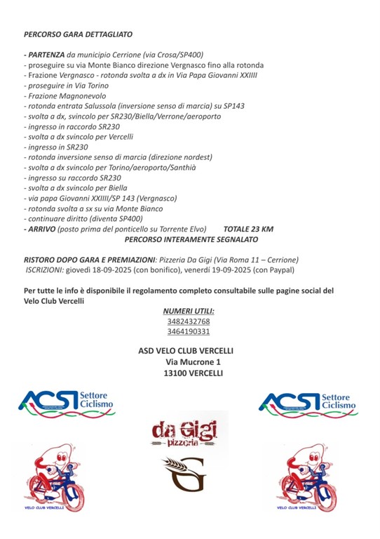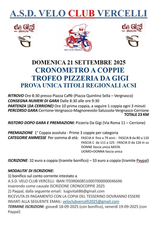 Il regolamento completo, e tutte le informazioni, sono disponibili sui canali social del Velo Club Vercelli e dalla mail veloclubvercelli2025@gmail.com"