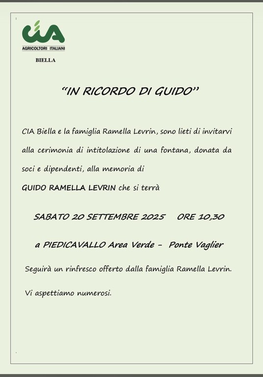 Sabato 20 settembre, alle ore 10.30, presso l’area verde del Ponte Vaglier a Piedicavallo, si terrà una cerimonia di intitolazione di una fontana dedicata a Guido Ramella Levrin, dipendente di CIA Biella scomparso lo scorso gennaio, a soli 62 anni, dopo una lunga malattia.