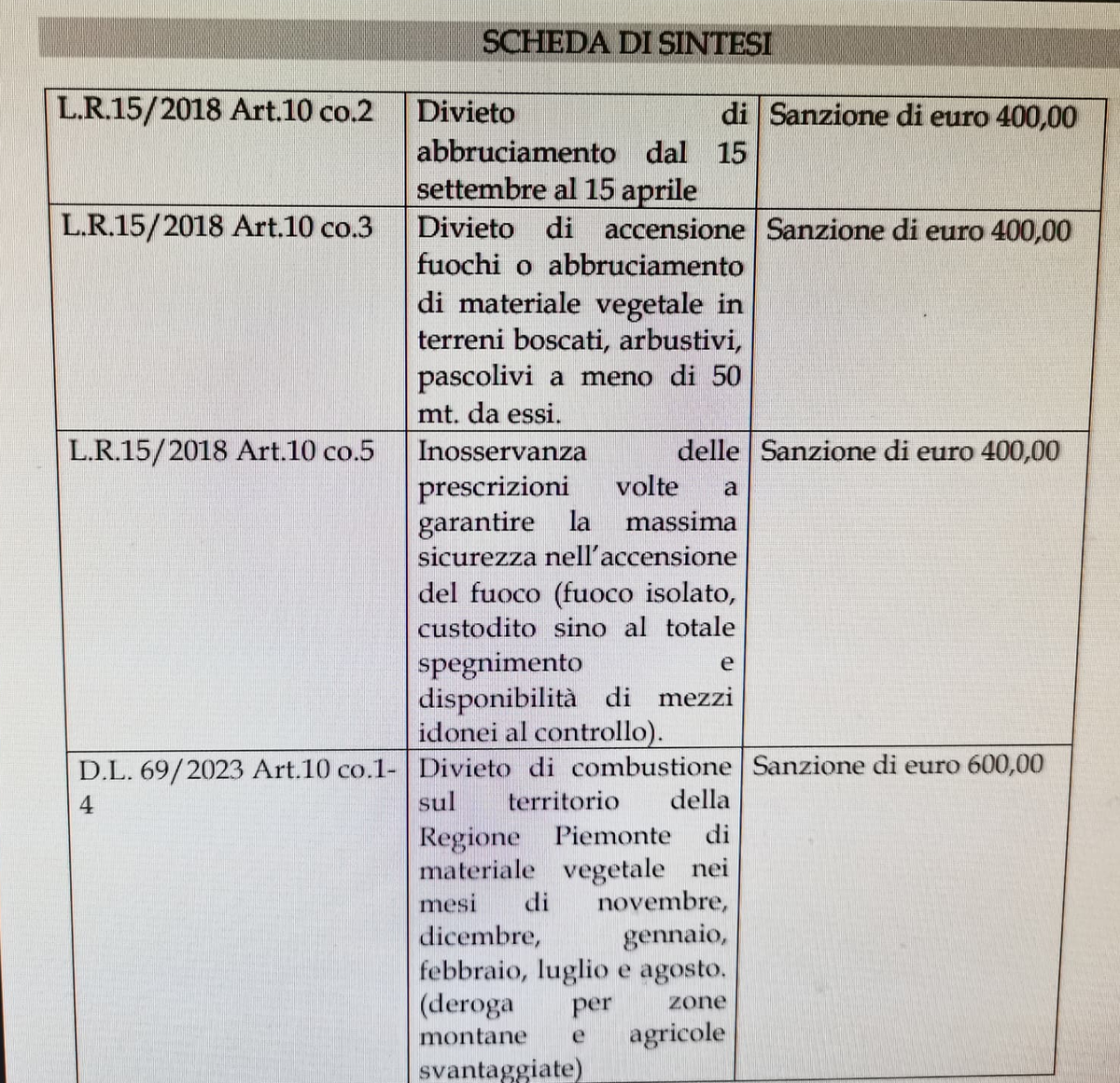 La normativa regionale (Legge Regionale n. 15 del 4 ottobre 2018) stabilisce che, su tutto il territorio piemontese, è vietato bruciare residui vegetali dal 1° novembre al 31 marzo di ogni anno. Per le risaie, il divieto inizia già dal 1° settembre. L'inosservanza di queste disposizioni comporta sanzioni amministrative che vanno da un minimo di 200 € a un massimo di 2.000 €.